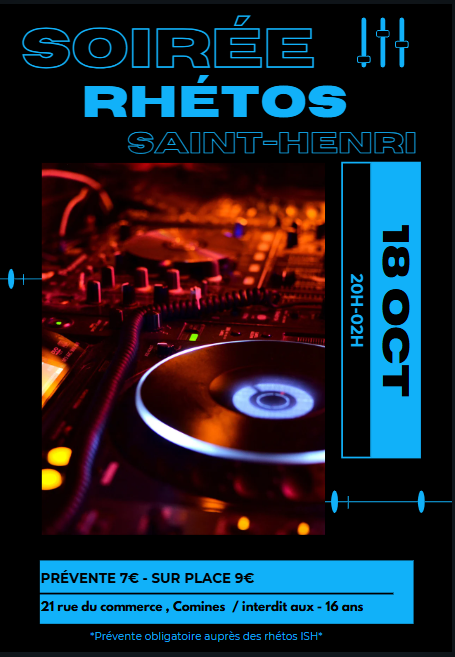Une affiche pour une soirée rhétos pour des élèves de 6ème secondaire.